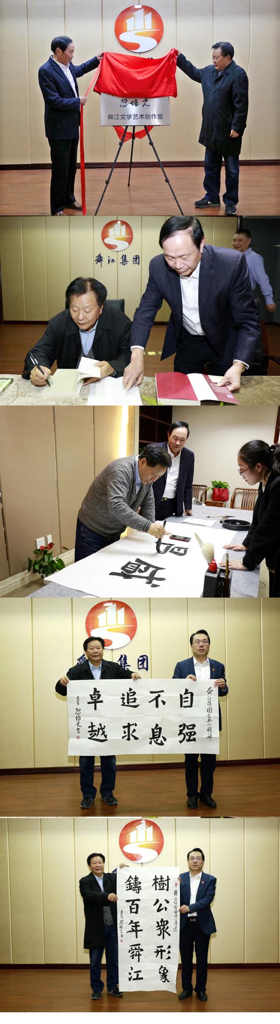 11月4日下午,“作家、书画家忽培元舜江文学艺术创作室”成立揭牌仪式及赠字赠书仪式在我集团公司举行。继美丽乡村建设恳谈会之后,由控股集团李金奎董事长与忽培元老师共同为创作室揭牌,在与会人员热烈的掌声中,作家、书画家忽培元舜江文学艺术创作室正式成立。