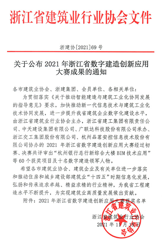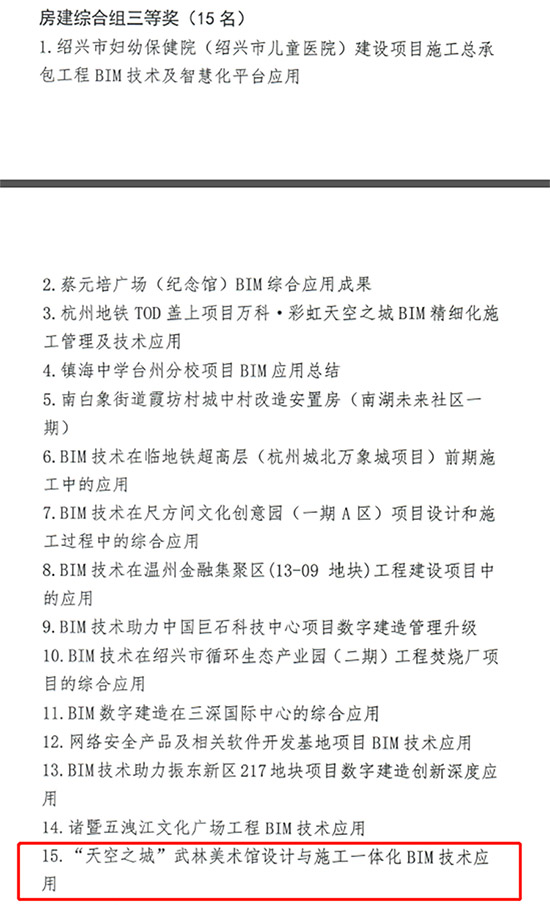 近日,由浙江省建筑业行业协会主办的2021年浙江省数字建造创新应用大赛经过初赛、决赛,其获奖名单正式公布。其中,由我建设集团BIM技术中心申报的《“天空之城”武林美术馆设计与施工一体化BIM技术应用》脱颖而出,荣获房建综合组三等奖。