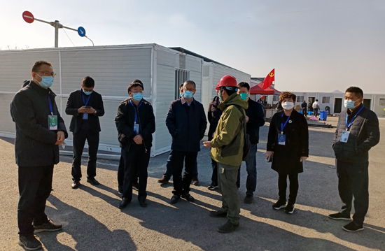 在热火朝天的项目一线,督导组一行获取了施工现场的第一手资料,问明了本项目隔离箱房的准确数量,并详细询问施工过程中存在的困难和需要协调的事项。我方领导汇报指出,联东U谷集中隔离点项目自12号正式开工以来,全体一线人员已经在“前线”连续奋战6天。当前,公司及项目指挥部已克服种种困难,一线全员共同努力、众志成城,全体党员群众、志愿者争分夺秒,不舍昼夜,全速推进项目进程。至18号上午,已完成全部411套隔离箱房主体搭建任务,目前已处于水电管路及设备调试、打扫收尾、生活用品放置阶段,至今晚基本具备人员居住条件。