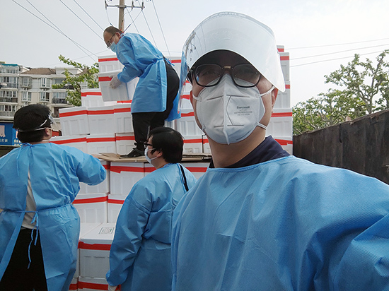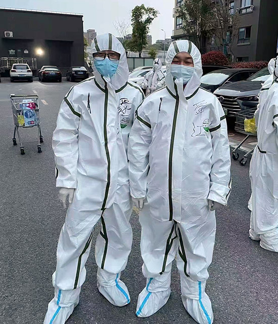 从3月中旬至4月初,上海总部职工黄全龙、胡建青参加了居住小区君莲闵都雅苑抗疫志愿服务队,负责小区内部秩序维护、快递外卖分发、按户发菜等工作,许多老人不会操作“随申码”,还要耐心地指导他们正确登录。在这个拥有6000多名居民的小区内,光是分发物资就能把人累得够呛,特别是穿着两层的防护层,一幢接着一幢,一个楼层一个楼层地分发,忙到子夜12点,终于分发完毕。这时,每个志愿者都已经精疲力竭,汗水早已湿透。一天的忙碌结束了,第二天还要继续。这样的工作强度,他们一连干了十几天,分发物资、协助核酸采样、分发抗原自测盒,直到自己所在的楼幢出现确诊病例,楼幢被封不能出门。