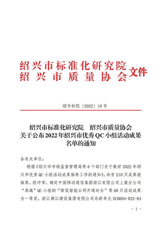 近日,绍兴市标准化研究院、绍兴市质量协会公布2022年绍兴市优秀QC小组活动成果名单。其中,由我建设集团东新单元XC0604-R22-04地块服务设施用房项目QC小组《提高底板后浇带施工质量一次验收合格率》、杭政储出[2018]51号地块商业商务用房项目QC小组《提高钢筋保护层一次验收合格率》两课题分获二等奖、三等奖。