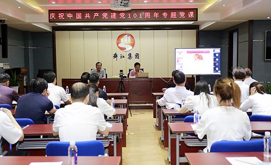 为欢庆建党101周年,结合上级党组织“党课下基层”系统活动,7月3日晚,集团党委特别举办了一堂专题党课——《在共同富裕美好社会建设中践行初心使命》。会议以视频直播形式举行,集团党建指导员邵百尧、集团原党委书记李金奎、党委书记李标、副书记谢惠珍与上虞支部党员、预备党员、入党积极分子在现场听取了课程,其余各支部党员通过视频直播收看了党课。党委书记李标主持党课,上虞区委理论宣讲专家团成员、区政协原副秘书长、研究室主任金永坚老师为全体党员授课。