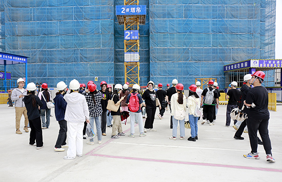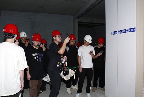 在基地校外指导老师、项目经理李炎淼的陪同讲授下,科艺学院建工学院土木工程系4个班的学生依次进入工艺样板和安全教育培训体验区及楼栋内,相继参观了工地样板展示区、安全体验区、VR安全体验馆,以及工程实物质量和工序样板展示。在听取指导老师讲授的同时,纷纷拿出手机拍摄记录,并认真交流讨论。