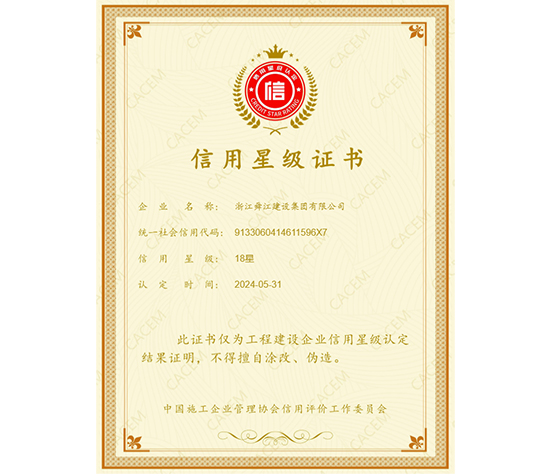 一直以来,我建设集团秉持“以人为本、诚信经营、塑造精品、奉献社会”经营理念,近年来,更是将诚信品牌建设作为企业发展重中之重,不断打造企业核心竞争力,不断提升舜江特级企业“重质践诺”良好品牌形象,赢得各地各界口碑和荣誉。在全国工程建设信用星级升18星的同时,企业继续保持中施企协、中建协信用AAA级、上海市建筑业诚信企业、浙江省AAA级“守合同重信用企业”等荣誉和信用认定。