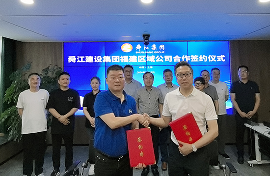 李斌总经理与福建区域管理团队负责人詹毅鹏共同签署合作协议,李标董事长与参加仪式全员共同见证舜江福建区域公司的成立及协议的签署。