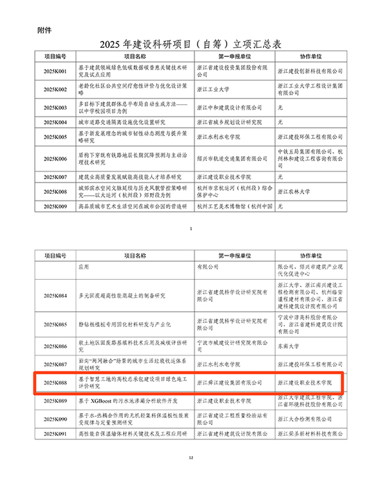近日,浙江省住房和城乡建设厅发布《关于公布2025年建设科研项目(自筹)立项的通知》,由我建设集团作为第一申报单位,联合浙江建设职业技术学院共同开展的科研项目——《基于智慧工地的高校总承包建设项目绿色施工评价研究》经过严格评审,成功获批立项,标志着公司在响应国家“双碳”战略,拥抱智慧工地、智能建造和绿色施工浪潮的科技创新道路上又迈出了坚实一步,是公司科研实力前瞻布局的重要体现。