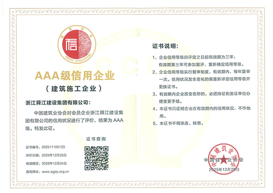 “中国建筑业协会AAA级信用企业”认证是中国建筑行业最高级别的信用评价,每三年滚动评定一次,涵盖企业综合素质、履约能力、社会责任等多项核心指标。该认证不仅是企业信用的“金字招牌”,更是行业权威机构对集团综合实力和合规管理的高度认可,可在行政审批、市场准入、融资信贷等领域发挥重要作用,为企业拓展业务提供有力支撑。